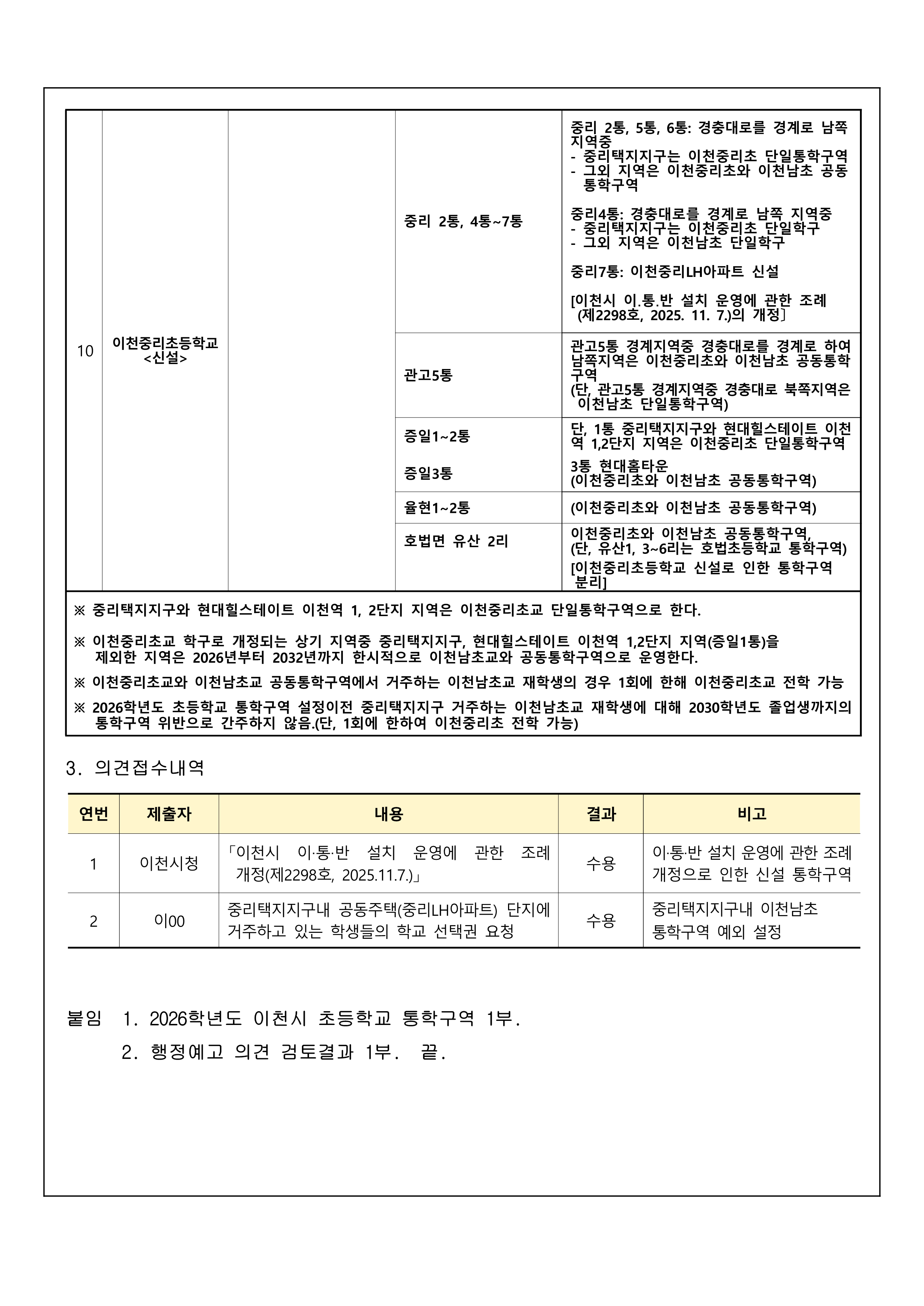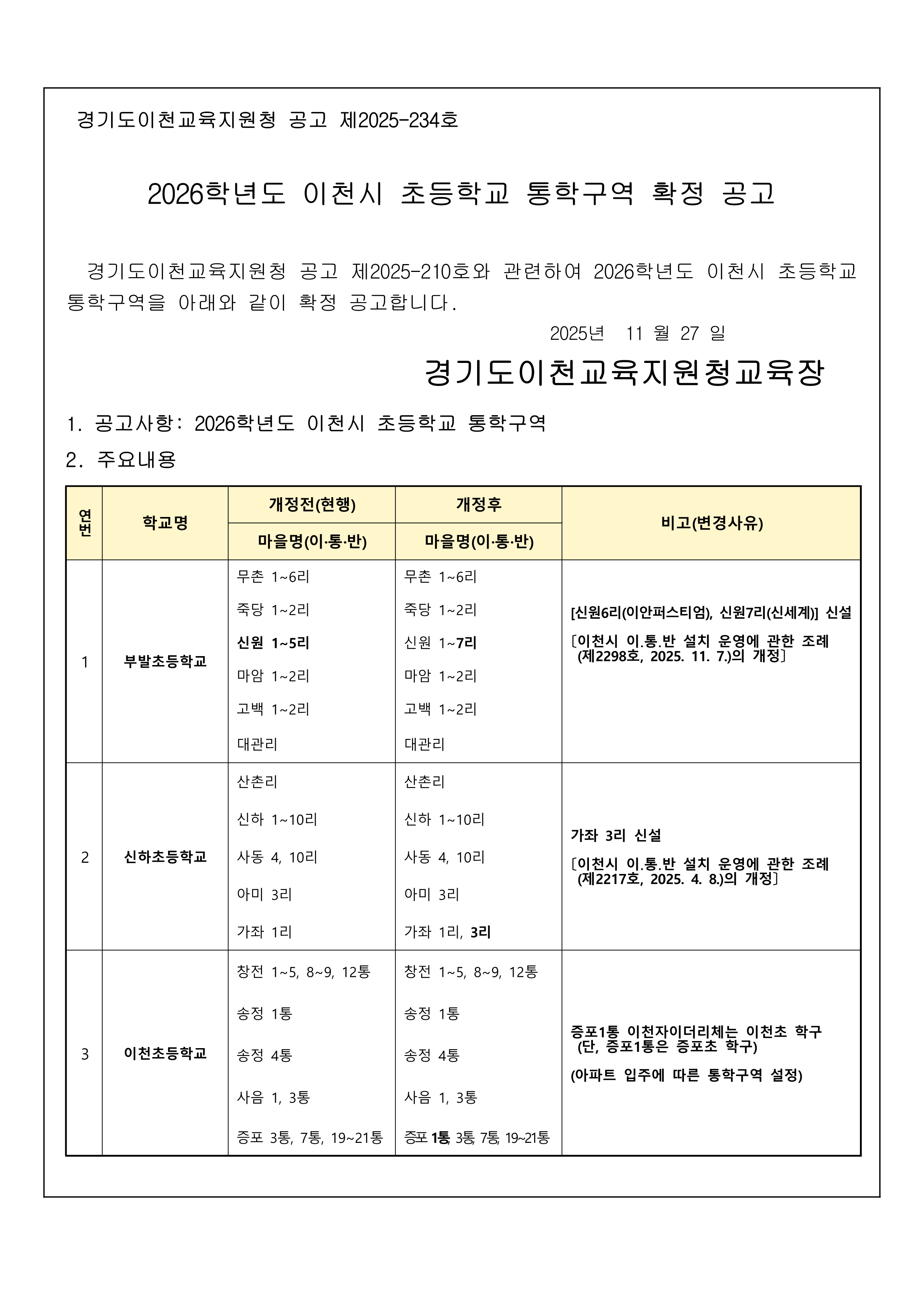 첨부 파일 1. 2026학년도 이천시 초등학교 통학구역 확정 공고문 1부.