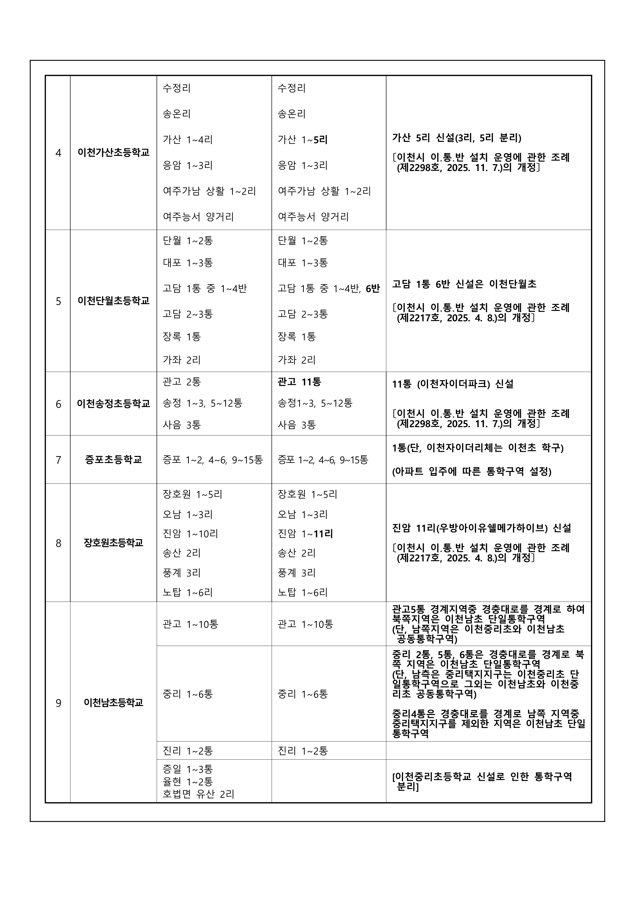 2026학년도 이천시 초등학교 통학구역 확정 공고